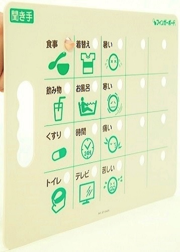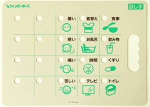 | □ 対面式会話補助具「フィンガーボード」は【Amazon.co.jp】にて発売中! ※お急ぎの方は「お急ぎ便」又は「お届け日時指定便」をご利用ください 。 ● フィンガーボードは 病院、リハビリテーション・介護施設等で透明文字盤と併用されています。 ● 対面式会話補助具を検索すると聴覚障害支援用品ガイドにフィンガーボードが紹介されています。 ● 対面式会話補助具 看護師を検索すると、看護師さんのサイト「看護力アップ」応援記にフィンガーボ ードの使用実例が紹介されています。 ● 言語障害機能訓練用具としてご使用できます。 ※ お使いの環境(ブラウザ等)の違いにより、実際の商品と色味が異なる場合があります。 予めご了承ください。 |